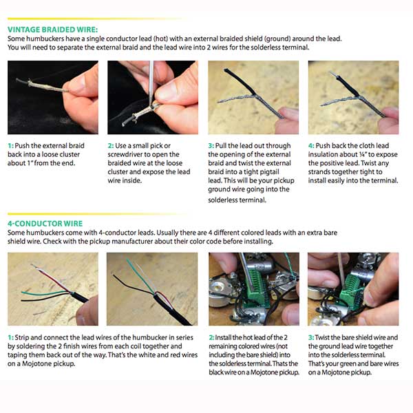 - Una vez colocado el Kit, debes pelar los cables de la «pastilla/pickup» tal y cómo enseña la foto de mas abajo.